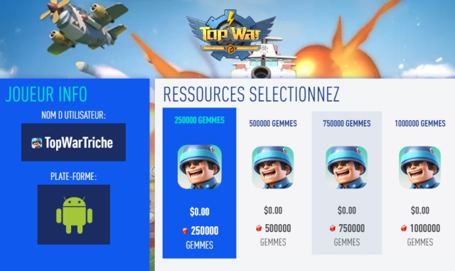 Vous êtes un joueur de Top War ? Vous cherchez un outil de Top War triche ? Certains des joueurs célèbres sur Top War ont beaucoup de Gemmes et Or. Ils peuvent acheter tout ce qu’ils veulent avec ces Gemmes et Or, mais pour un nouveau joueur ou un autre joueur qui n’a pas assez de Gemmes et Or, c’est vraiment triste. Les Gemmes et Or en Top War sont importantes. Si vous voulez être un joueur célèbre, vous devez avoir un personnage unique et un monde unique. Mais comment être un joueur célèbre si on n’a pas de Gemmes et Or ? Maintenant vous entrez dans le bon site pour obtenir beaucoup de Top War Gemmes et Or INSTANTANÉMENT ! La chose la plus importante est que notre outil de triche Top War est GRATUIT à utiliser. Nous ne vous facturons même pas 1 centime pour utiliser notre Top War Astuce en ligne. Notre équipe pense que peut-être un homme bon va nous faire un don pour garder notre Top War Astuce en vie pour un long moment.
